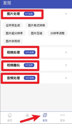 3、在“发现”页面中,您可以挑选图片处理、视频处理或音频处理的功能模块,以便迅速找到所需的编辑工具。
