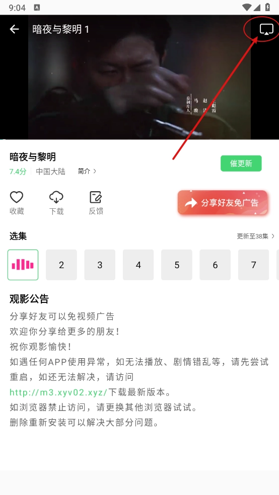 2、进入播放详情,点击右上方的"投屏"标志。