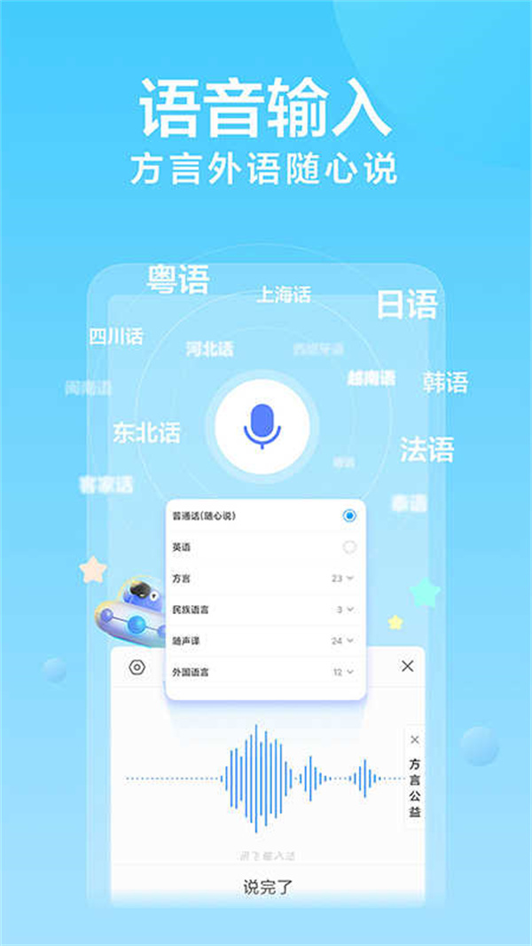 2、方言输入:支持23种方言输入,普通话不标准、带口音也能随心说
