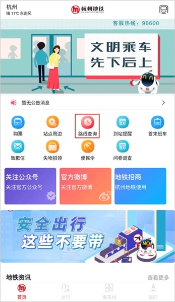1、进到杭州地铁,在首页上方选择“路线查询”
