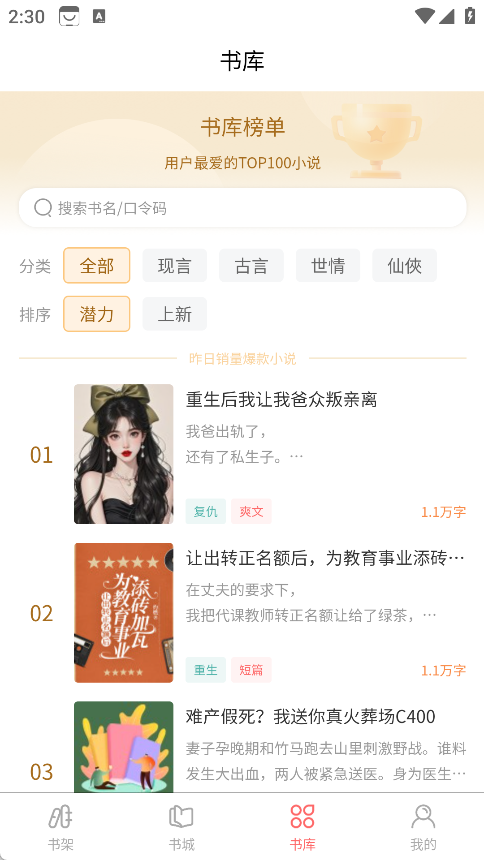 3、在书库中可以了解最新的书库榜单,还有很多不同的分类在里面。