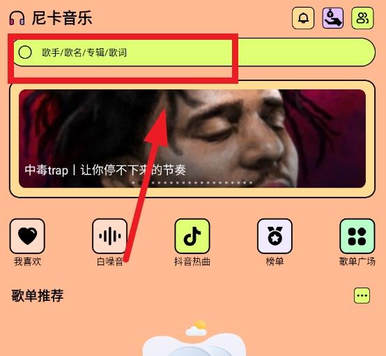 1.打开尼卡音乐App,在首页通过搜索框来搜索自己喜欢的音乐