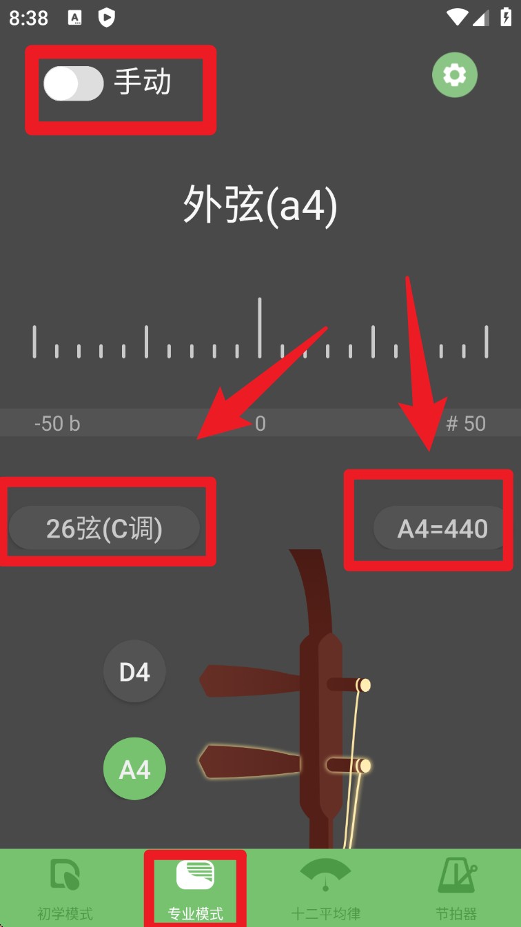 2. 如需更高精度或手动操作,点击底部的“专业模式”,可进入精准调音界面,左上角可切换“自动/手动”,中间指针会显示音准偏差。