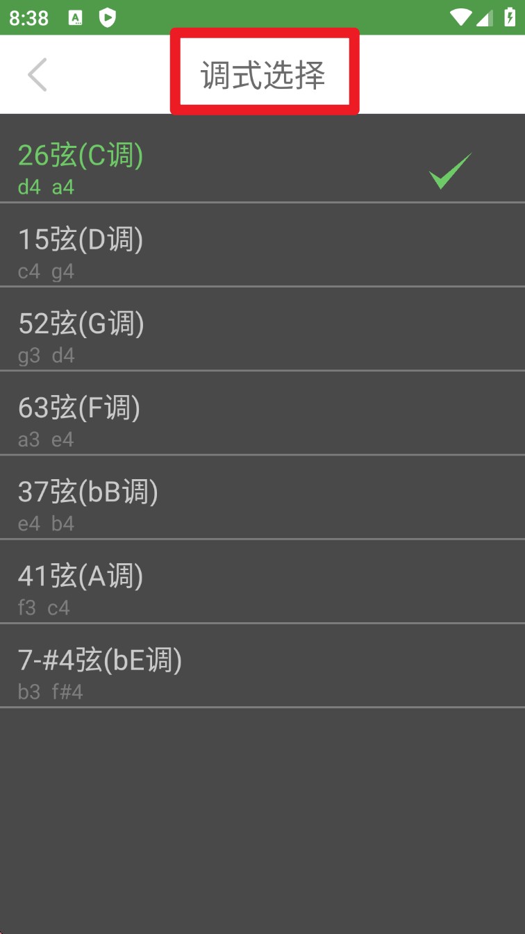 3. 点击左下角的调弦名(如26弦C调),可以自由选择不同的调式,包括D调、G调、bB调等,适配多种民族乐器的演奏需求。