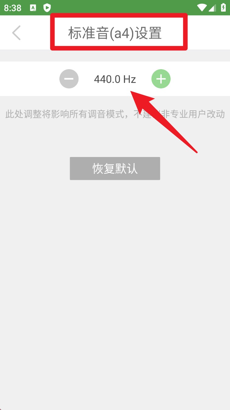 4. 如果需要调整标准音高,可进入设置中的“标准音设置”,通过“+”或“-”调节A4频率(默认440Hz),支持更专业的频率校正。