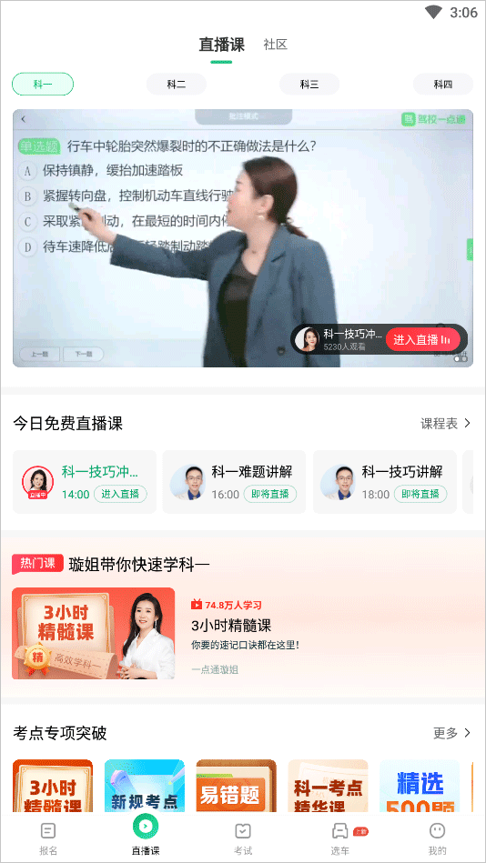 推出科目一、科目二、科目三、科目四的在线直播课,特邀经验丰富的驾考讲师,教学互动,高效学习快速掌握。