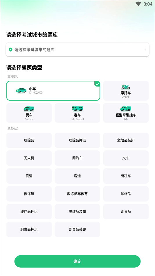 1、打开软件首先我们可以选择考试的城市以及考试的驾照类型
