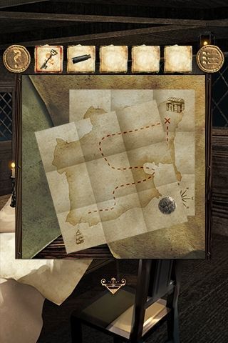 6、拿到望远镜用来看窗外看到两位人鱼小姐姐,红色左边蓝色右边,椅子上拿到一个脏项链,到炮台房用水洗干净,可以看到项链上的密码,按照红左蓝右得“king”,在右甲板的房间宝箱上输入拿钥匙,回船长室画像右侧使用拿海图过关(注意必须先看望远镜上图案,才能在画像右侧找到钥匙孔);