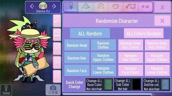 如左边蓝色区域依次是:全部随机、随机头、随机衣服、随机发型、随机上身、随机脸、随机下身。