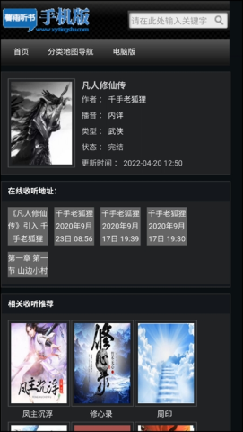 馨雨听书网,绝对是你手机听书的不二之选!这里的有声小说库丰富到超乎想象,无论是惊悚刺激的恐怖小说,还是浪漫动人的言情小说;无论是厚重深沉的历史小说,还是贴近生活的现代小说,总有一本能戳中你的心。虽说它的界面风格略显复古,但可别被这外表蒙骗,其功能强大得很,支持在线收听,让你的双手和双眼彻底得到解放,畅游在小说的精彩世界里,根本停不下来,那种感觉,简直爽翻啦!