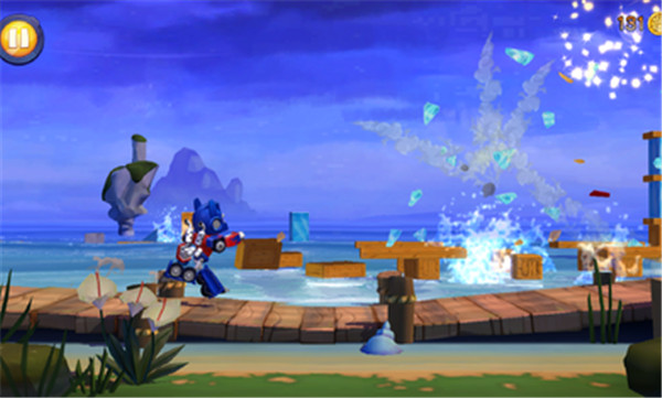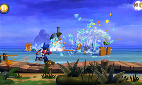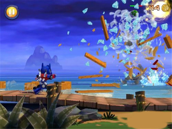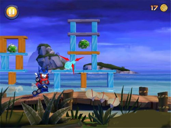 通常,绿猪都位于建筑物上。在游戏初期,玩家还没有升级变形金刚时,攻击力较弱,直接攻击绿猪可能无法在跑酷过程中将其消灭。因此,玩家只需击碎屏幕中红色方框标记的“玻璃”,建筑物便会倒塌,绿猪将随之落入海中。射击时应按照冰块>木块>石块的优先级顺序进行。