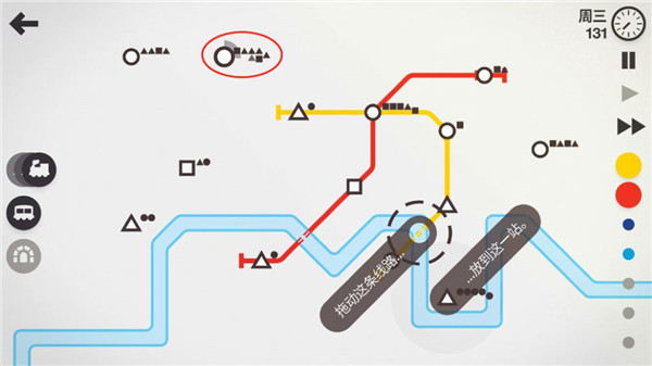 站台旁边的小图形代表该站点乘客的数量以及乘客的目的站台,乘客需要抵达与其符号形状相同的车站。