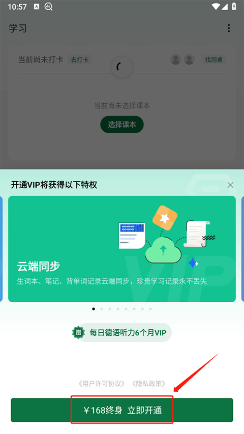 1在学习页面向下滚动刷新后,会弹出开通VIP特权的窗口,点击“立即开通”并完成支付即可。