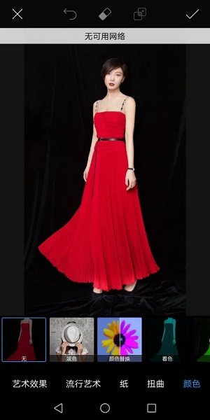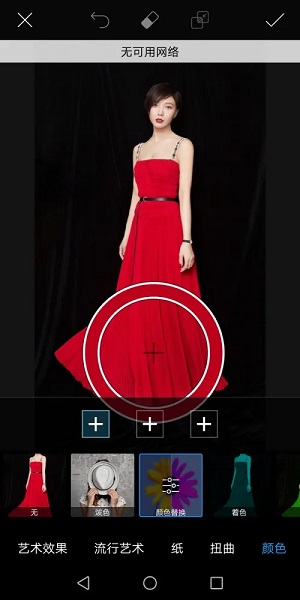 如果需要修改的地方是单一颜色,并且这张照片的其他部分没有相似的颜色——请选择最下方菜单栏中的“颜色”选项,然后直接点击“颜色替换”特效,选中需要调整颜色的区域,通过拉动“重置色度”的色度条来选择新的颜色即可。