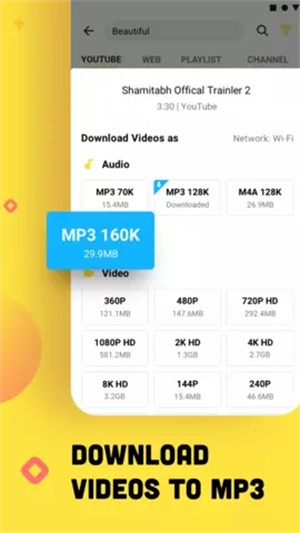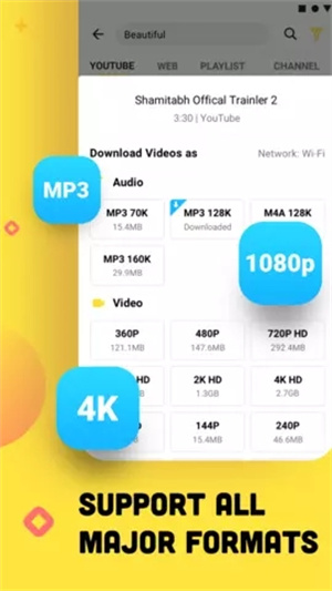 SnapTube Pro解锁版会员版支持多种分辨率的mp4视频,比如:360P、480P、720P、1080P高清等等,用户也可以任意任何YouTube音乐视频直接作为MP3格式文件。进而满足您的播放需求,随时听你喜欢的音乐视频。
