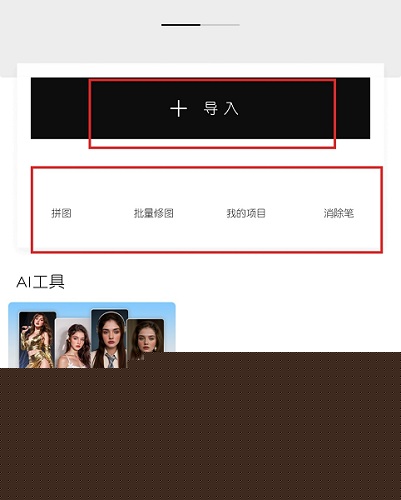 1、打开hypic,您会看到首页的功能布局。您可以点击中间的【拼图】、【批量修图】、【我的项目】或【消除笔】,也可以点击【+导入】进入修图页面。