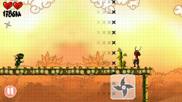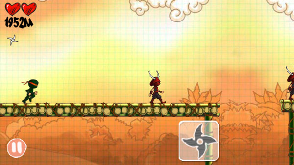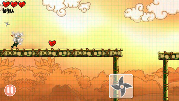 忍者突袭游戏的操作方法非常的简单,玩家可以通过点击屏幕控制忍者的奔跑、跳跃、发镖等动作,点击屏幕是跳跃,点击两次就是二段跳,点飞镖可以发射飞镖,操作就这么简单。忍者突袭一路上还可以收集路边的心形和风车形工具,红心能够补充体力,风车能够加速,游戏结束后玩家可以看到自己的战绩并获取相应的成就,感兴趣的朋友快来试试吧。