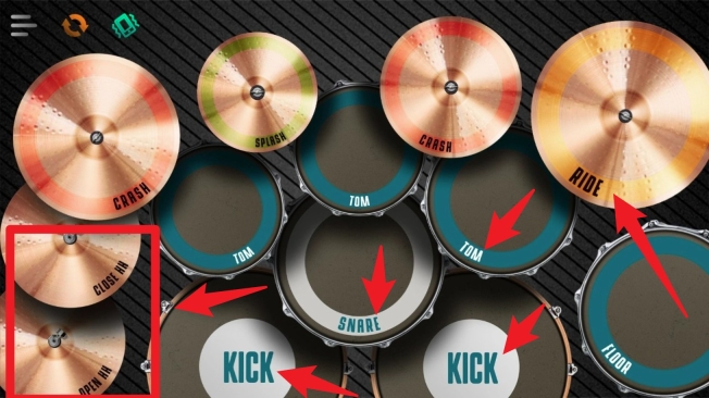 2. 左下角的 Kick 脚鼓和右侧的 Close HH、Open HH 踩镲都可以点击演奏,模仿真实的双手双脚演奏体验。