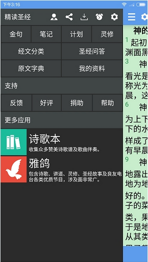 3、基于圣经,我们开发出了朗读、查经、金句、灵性、译文比对、原版词典、查“词典”计划、“圣经”问答等实用功能。
