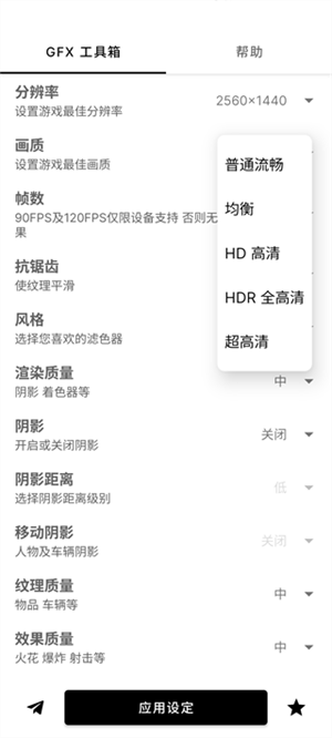 答:首先在工具箱中设置好上述参数,待工具箱应用设定完成后进入游戏。接着在游戏设置里,手动调整工具箱未能妥善修改的设定,例如将画质从高清调整为最流畅。
