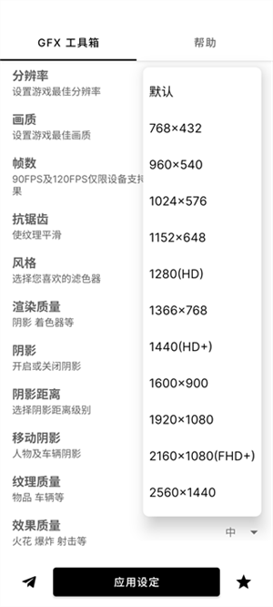 3、GFX Tool不仅能够调整画质,还能对分辨率进行调节。在“分辨率”选项中,你能够挑选游戏分辨率,范围从最低的“768*432”至高可达“2560*1440”,均可按需选择。