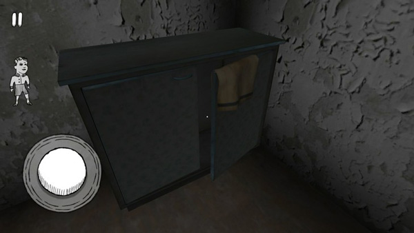 8、藏身地:游戏中可以藏身的地方有大衣柜,大衣柜打开后走到衣柜里然后关上门就可以了。打开的矮柜子,当你的白点指到他敞开的口时屏幕的右上方会有一个图标点击进入后就可以钻进柜子了,这个柜子在二楼。