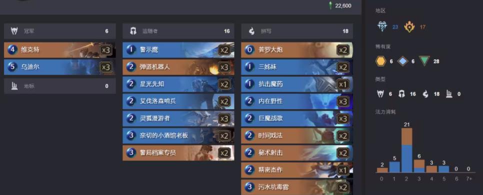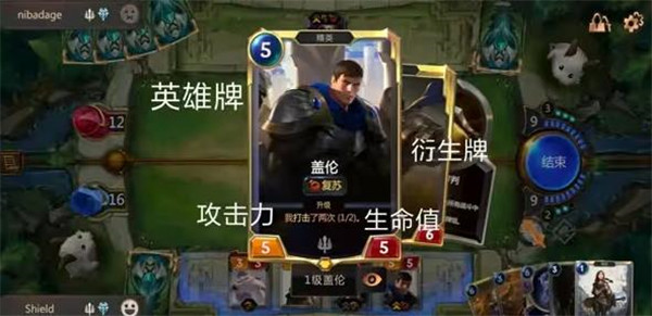 3、英雄卡:以盖伦为例,左上角的蓝色圆圈表示费用,左下角的橙色方块代表攻击力,右下角的红色方块代表生命值。