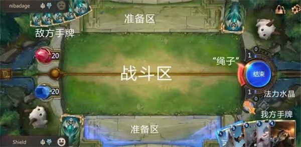 5、战斗界面主要分为三个区域:手牌区(对手的手牌不可见)、准备区(该区域的角色双方都能看到)和战斗区。(如图所示,界面上还有一些其他的交互元素)