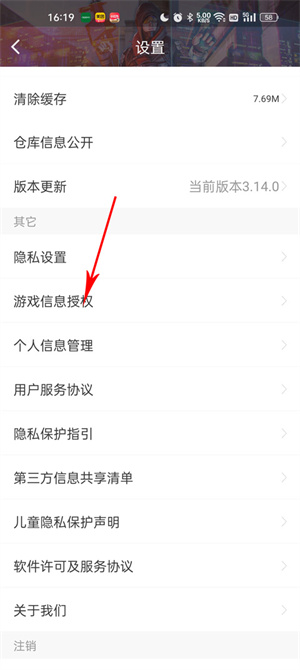 3、进入设置板块之后,我们一直往下翻,在其他分类里面找到游戏信息授权,点击进入;