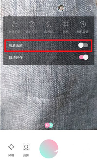 3、点击后,顶部会出现拍照设置的界面,在其中找到【高清画质】选项。该选项默认是关闭状态,点击它后面的开关以开启。