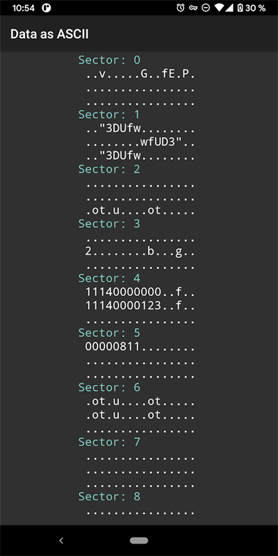 读取完成后可以看到如下界面,扇区0的第一行前8位就是卡号(UID)。我们要做的就是把卡号写入目标卡