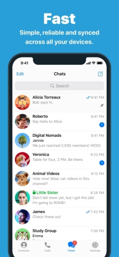 与 WhatsApp 不同,纸飞机 是一个基于云的无缝同步的信使。因此,您可以同时从多个设备(包括平板电脑和计算机)访问您的消息,并共享无限数量的照片、视频和文件(doc、zip、mp3 等),每个最大2 GB 。