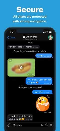 那些想要额外隐私的人应该看看我们的高级设置和相当革命性的政策。如果您想要保密,请尝试我们的设备专用秘密聊天,其中包含自毁消息、照片和视频,并使用附加密码锁定您的应用程序。
