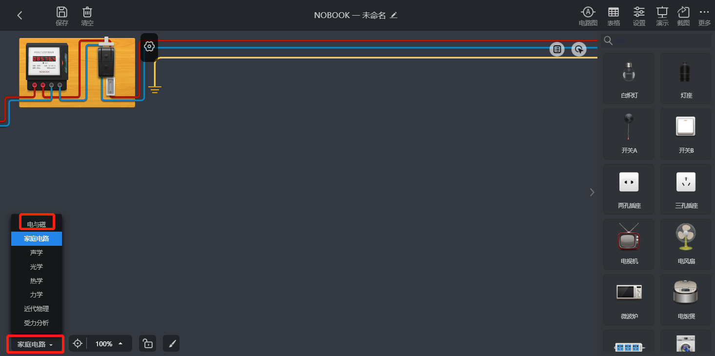 NOBOOK虚拟实验包含很多精品资源,也支持众多实验模块的自主探究,例如物理学科的力,热,声、光、电与磁、家庭电路、近代物理、力与运动与受力分析这九大模块,化学学科的无机化学与电化学模块,都可以通过自由组装来完成实验的DIY探究。