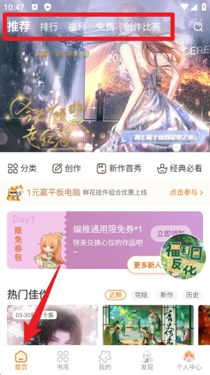 1. 打开App后,默认会显示“首页”标签页,在这里你可以查看推荐内容、排行榜、免费资源以及创作比赛,顶部的菜单栏可以帮助你快速切换页面。