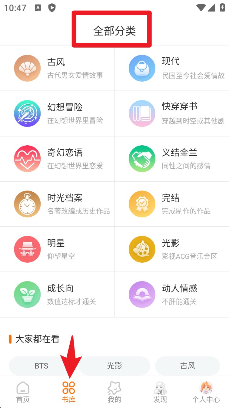 2. 点击下方导航栏中的“书库”图标,即可进入全部分类页面,支持按题材筛选你感兴趣的小说作品。
