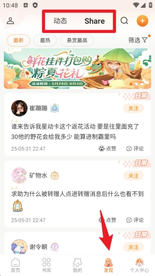 4. 点击底部的“发现”标签,在“动态”和“Share”区域,您可以浏览他人分享的内容,同时也可以发布自己的阅读体会。