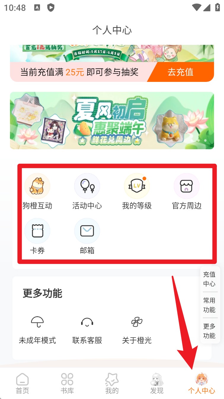 5. 进入“个人中心”,可管理等级、卡券、活动记录等功能,还能访问狗橙互动和周边专区。