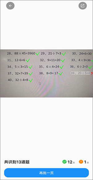 3、最后等待系统数秒,即可快速高效的批改孩子的口算作业,识别正确率也是非常高的,如果有多页也可以直接点击“再批一页”进行拍照。