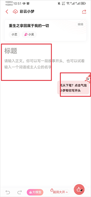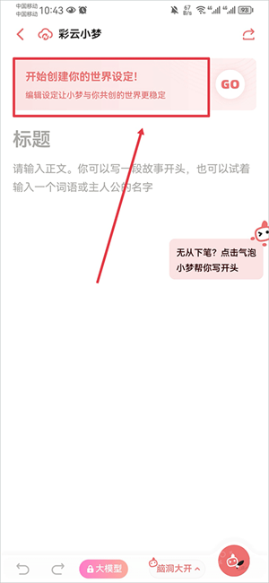 5、世界设定创建完成后你就可以在为该设定续写故事、正文啦,若觉得无从下笔后,你可以通过点击气泡小梦来帮你写开头