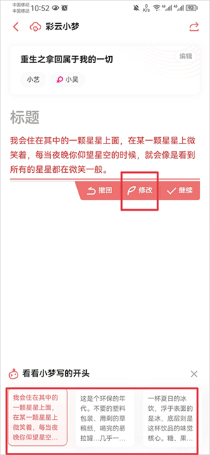 6、点击小梦后,将自动为你生成故事开头,你可以左右滑动来挑选合适的故事开头,选择后觉得内容不满意后你也可以点击修改进行内容改写