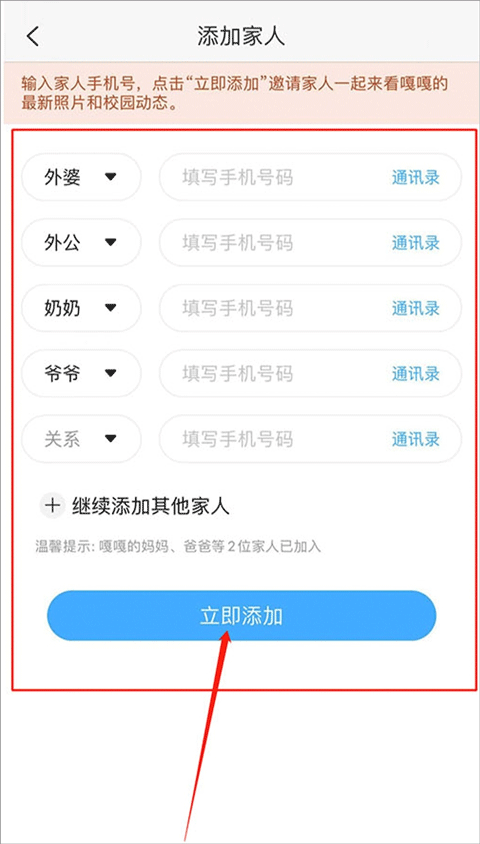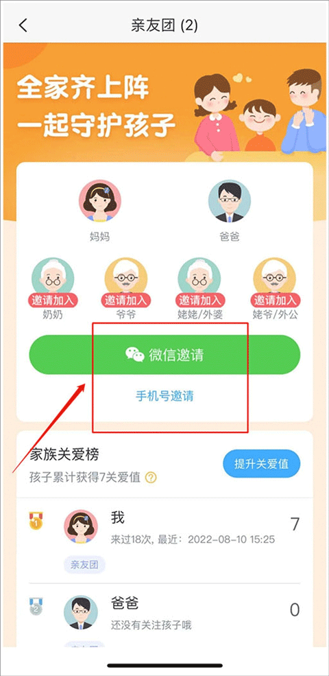 3、例如手机号邀请,将对应身份的手机号输入,并提醒该家庭成员使用手机号登录即可