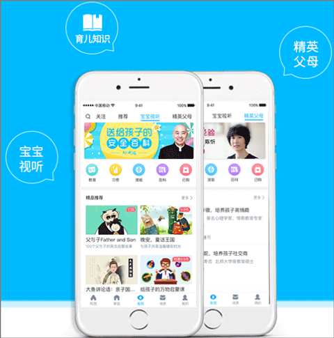 根据宝宝和家长的需求,开设宝宝视听、精英父母两个育儿频道,层层筛选优质内容,个性化推荐,定向推送,解决家长育儿道路上的各种问题。此外,还有喵姐高寿岩、张怡筠、郑渊洁等育儿大咖入驻,实时分享育儿心得。