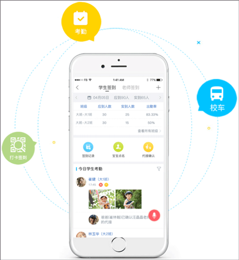 校车考勤系统:实时监控校车行车动态;校车考勤系统与园所考勤系统联动,随时掌握宝宝签到情况。