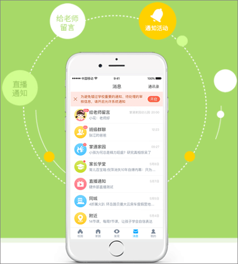 通知活动:在线发布图文通知、活动,老师及时提醒未看信息的家长。