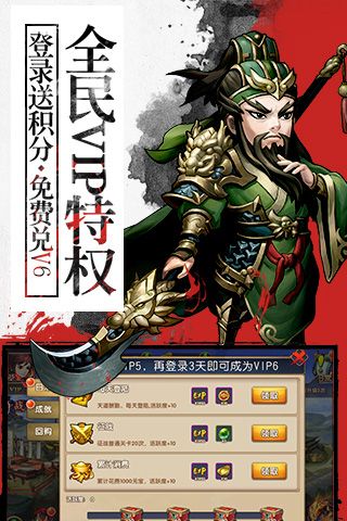 1、上线即赠VIP5、1W元宝、100W金币、1阶升星宝箱*20、VIP专属福利,立享超豪华VIP待遇;