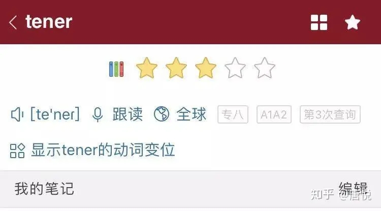 使用方法:在查看单词解释的界面中,点击屏幕下方的五角星图标,变为被填充过的五角星即收藏成功。此时,所查单词的下方会出现5颗五角星,通过标记五角星来对单词进行等级的划分,可以根据自己的喜好对单词划分等级,如自己对单词的掌握程度、单词的重要性等。