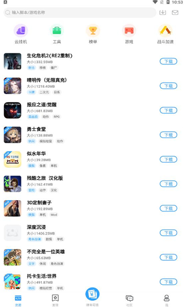 一共分为云挂机、工具、榜单、游戏、战斗加速插件等五个大分类,为用户提供实用的资源分享