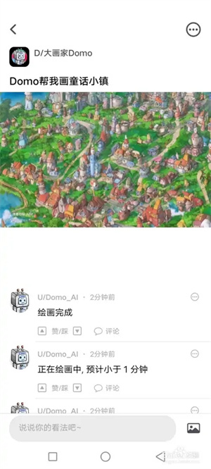 4、在帖子标题中写上“Domo帮我画”,然后输入你希望AI绘制的内容并发布,等待绘画完成即可。
