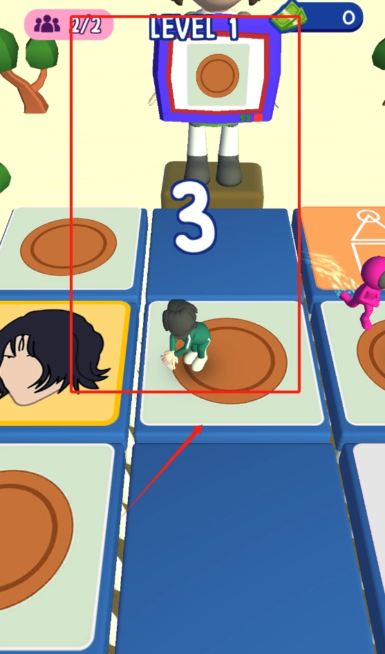 2、根据彩色方块的移动来操控角色,让绿衣小人成功跳到终点,注意千万别掉下去啦。
